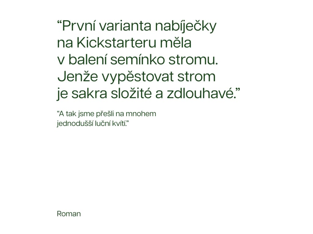 Tento produkt to celé odstartoval. V roce 2020 jsme navrhli první verzi této nabíječky a úspěšně na její výrobu vybrali peníze na Kickstarteru od lidí z celého světa. Měl to být jen malý projekt, ale trochu se nám to rozjelo – máme už pořádnou dílnu. Proto jsme treed charger několikrát iterovali a nyní si můžete koupit jeho nejnovější verzi – s podporou MagSafe a nabíjecím výkonem 15 W. Zdokonalená nabíječka vyrobená se stejnou láskou, vášní pro inovace a udržitelnost jako ta první z ponku ve stodole Romanova rodného domu v Bludově.